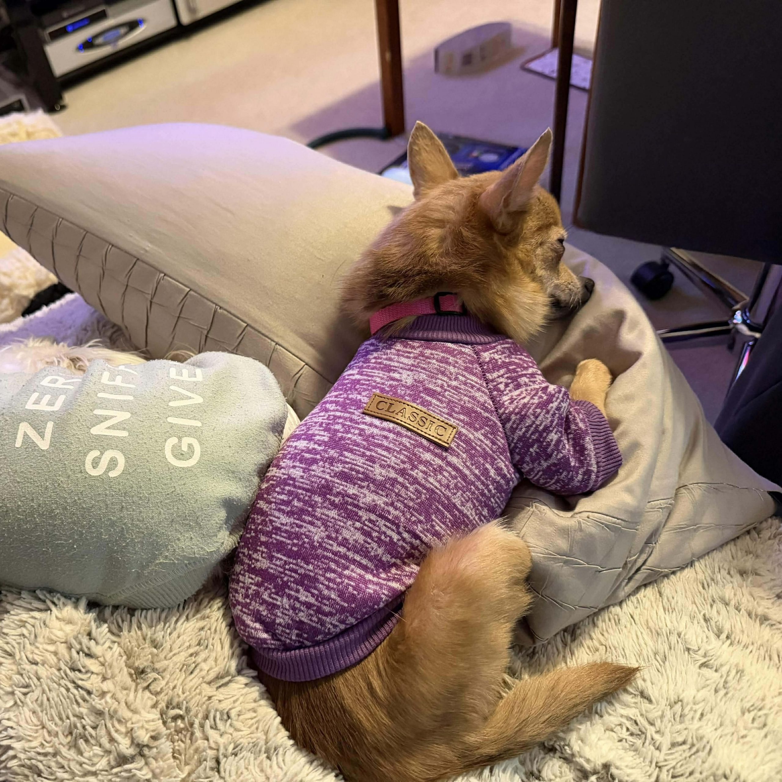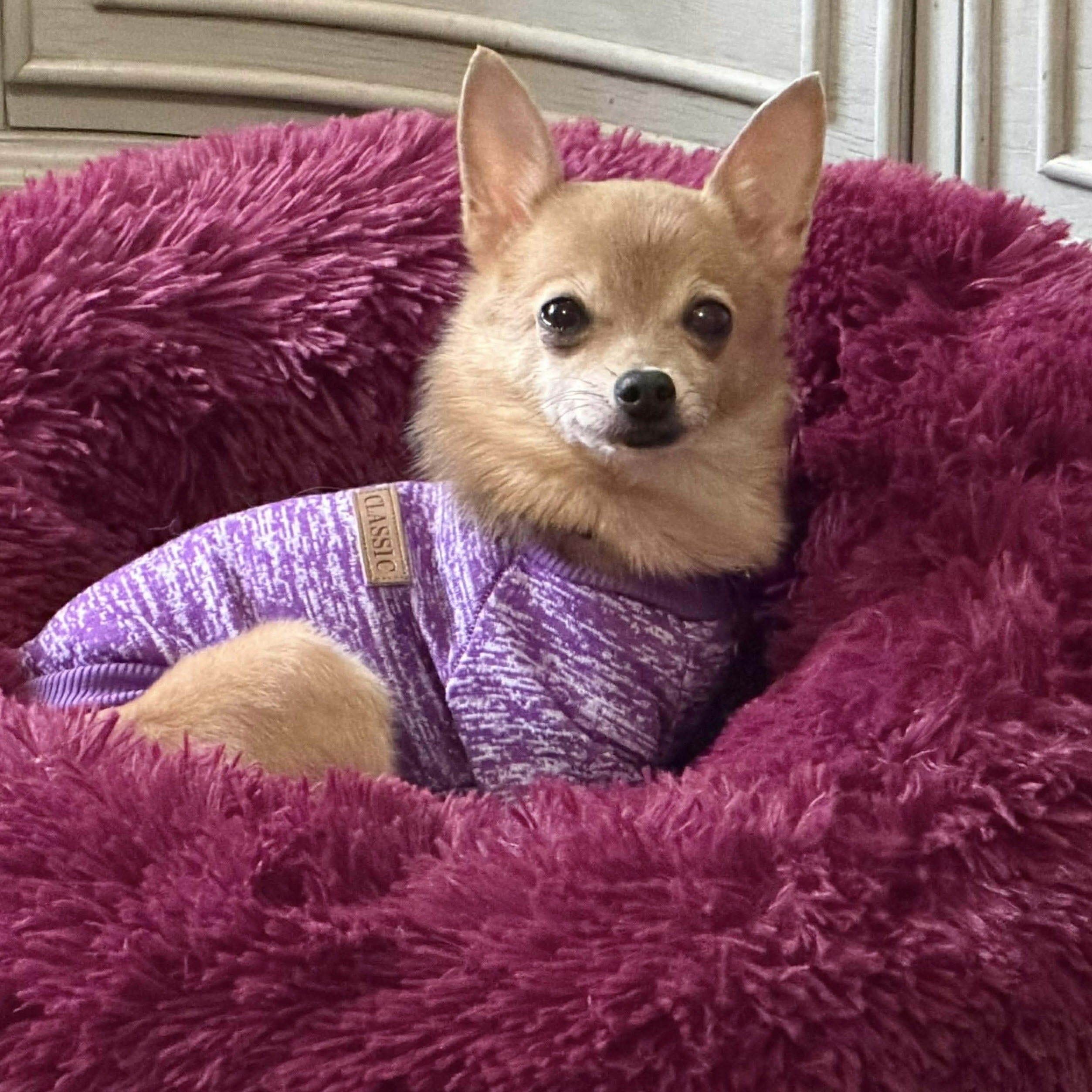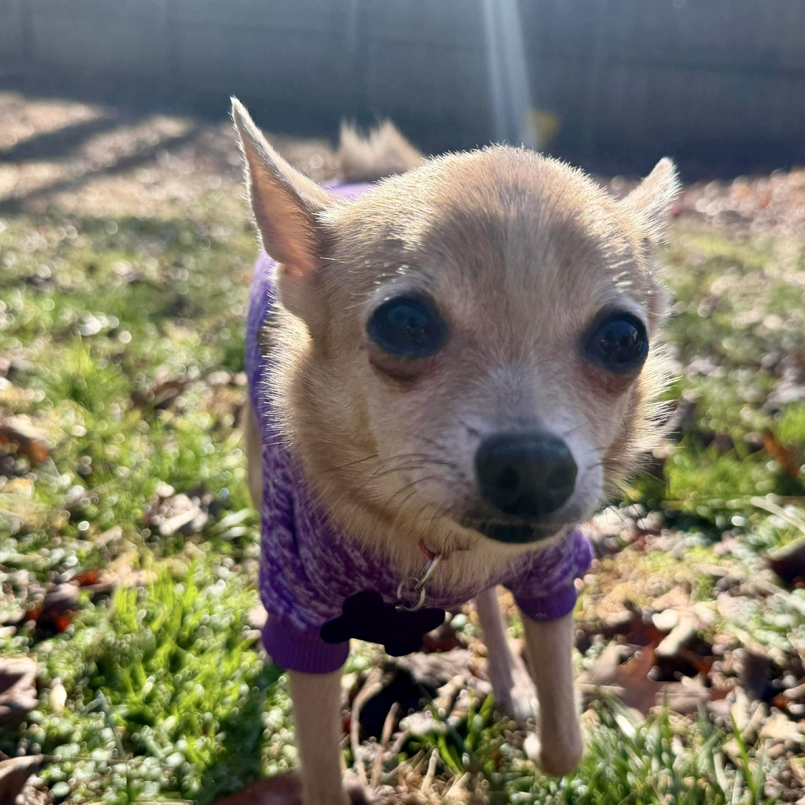 Meet Abigail — a 7 year old, 6 lb Chihuahua/Pomeranian mix with a heart as soft as the cozy blankets she loves to curl up in.