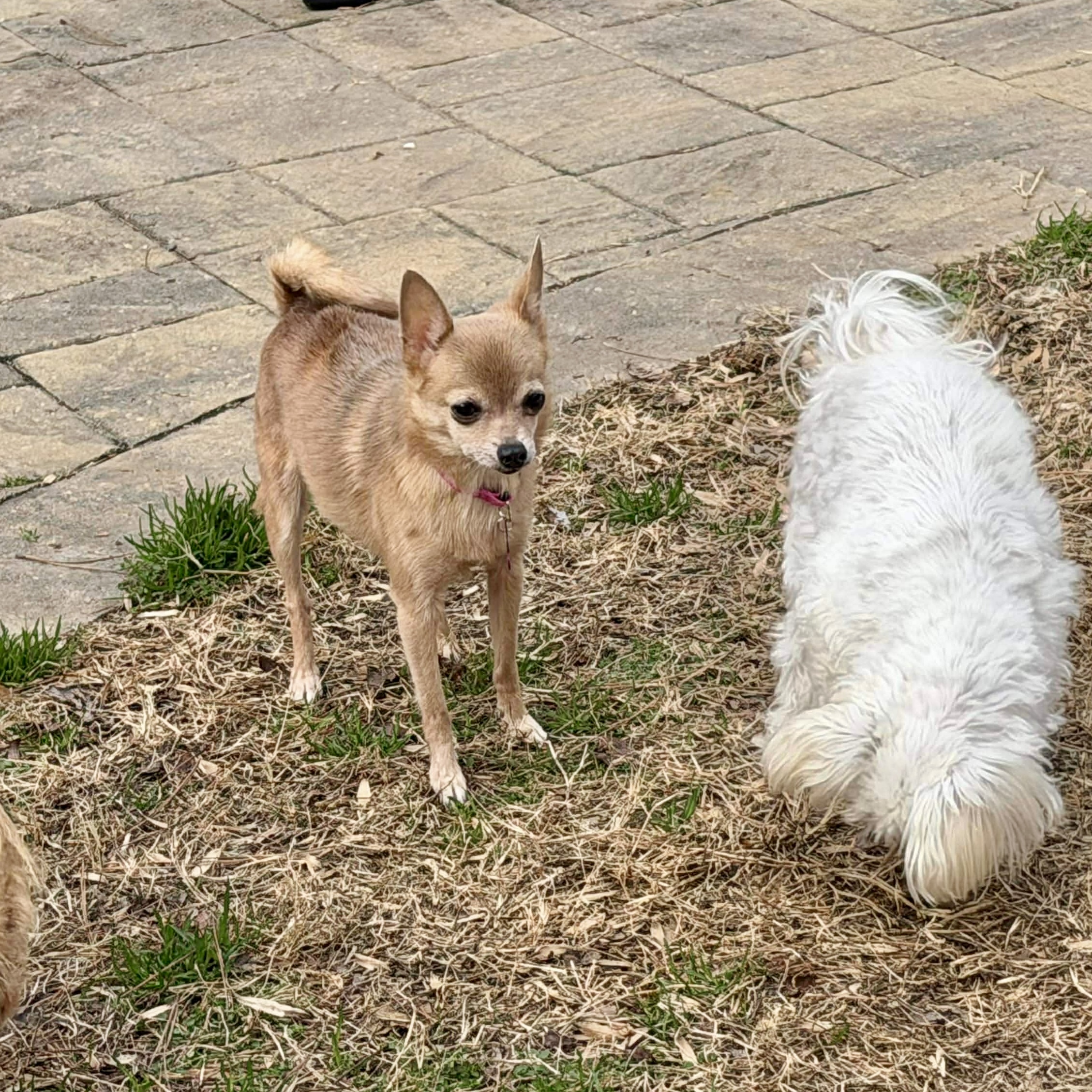 She’s not a big fan of leashes, but she enjoys exploring the yard and never wanders far from her person. A fenced yard isn’t required—she simply prefers to toddle around freely rather than walk on a leash. Abigail is incredibly friendly with everyone, including kids, and she gets along well with other dogs, especially those who are calm like she is. She hasn’t met cats yet, but her mellow nature suggests she’d likely do just fine.