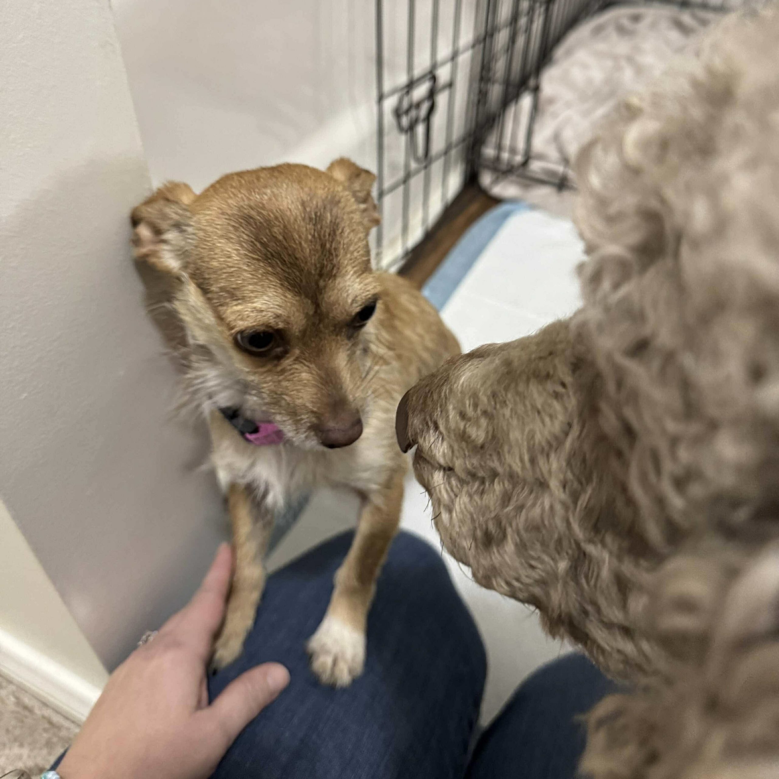 Capri is doing wonderfully with her potty training and even uses a pee pad in the home. With a bit of consistency and routine, she’ll keep improving. She’s crate trained and can relax in her crate when you’re away, though she’d much prefer to be with her people — especially if they have an open lap. She adores everyone she meets, including kids, and she’s been fantastic with other dogs, cats, and even farm animals like goats and chickens.