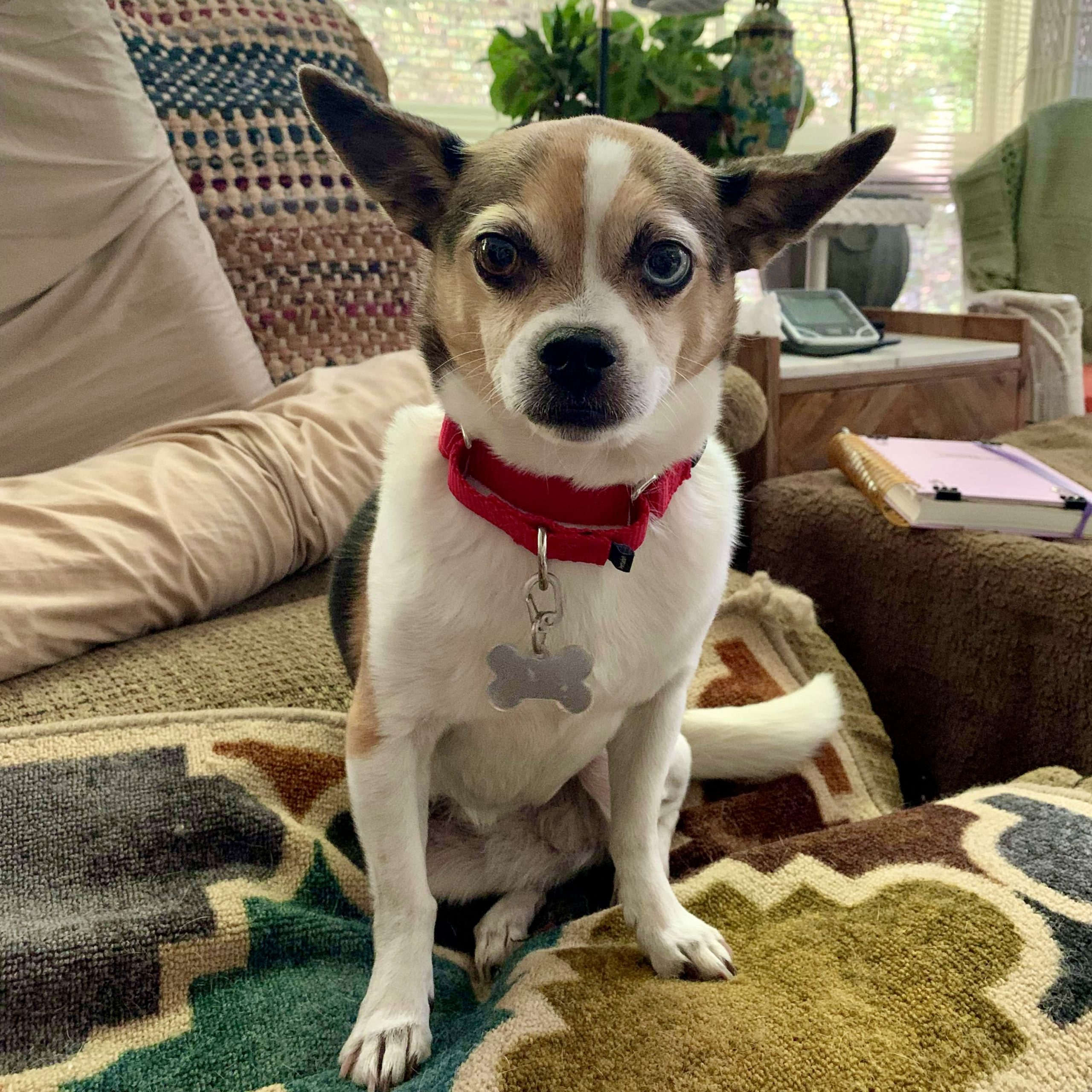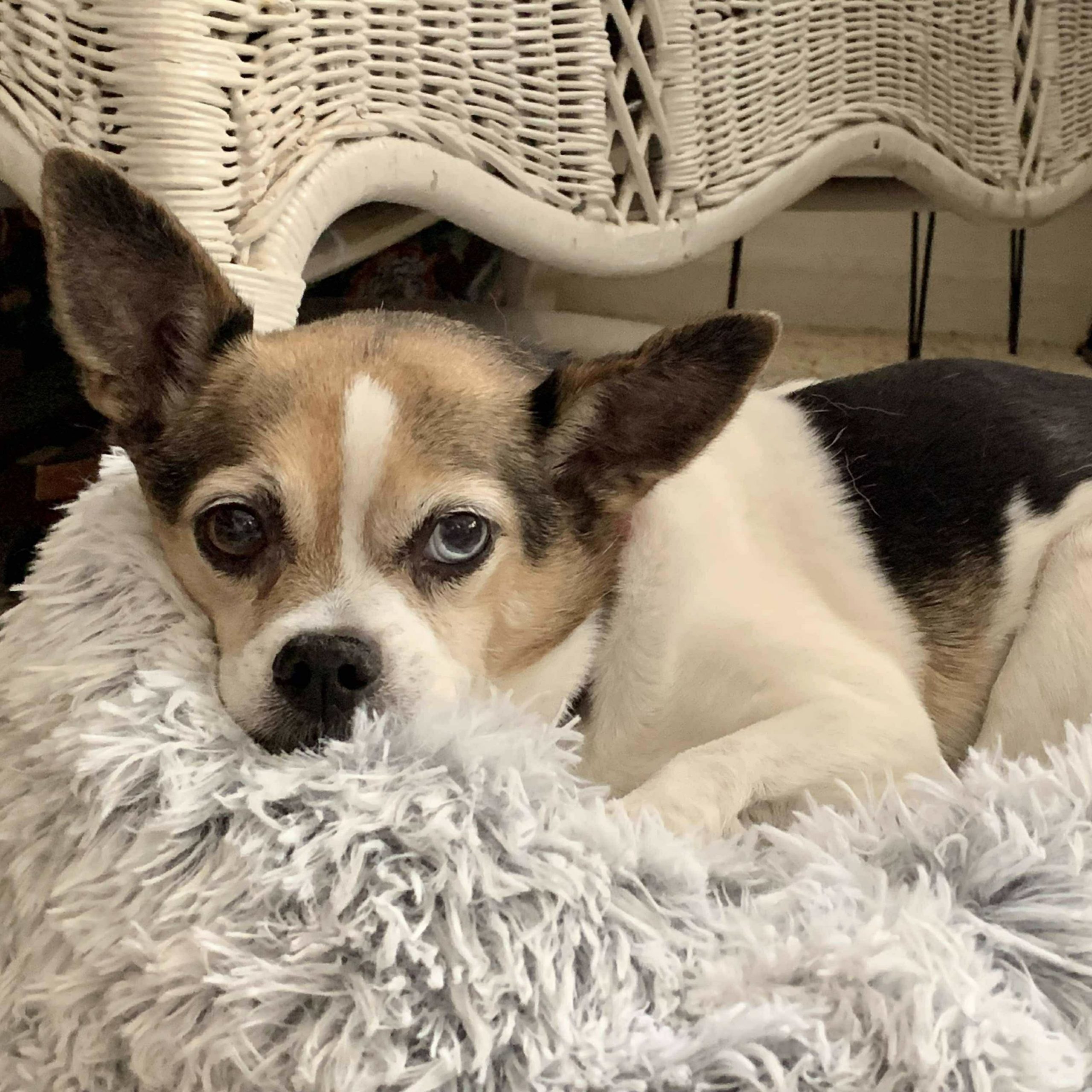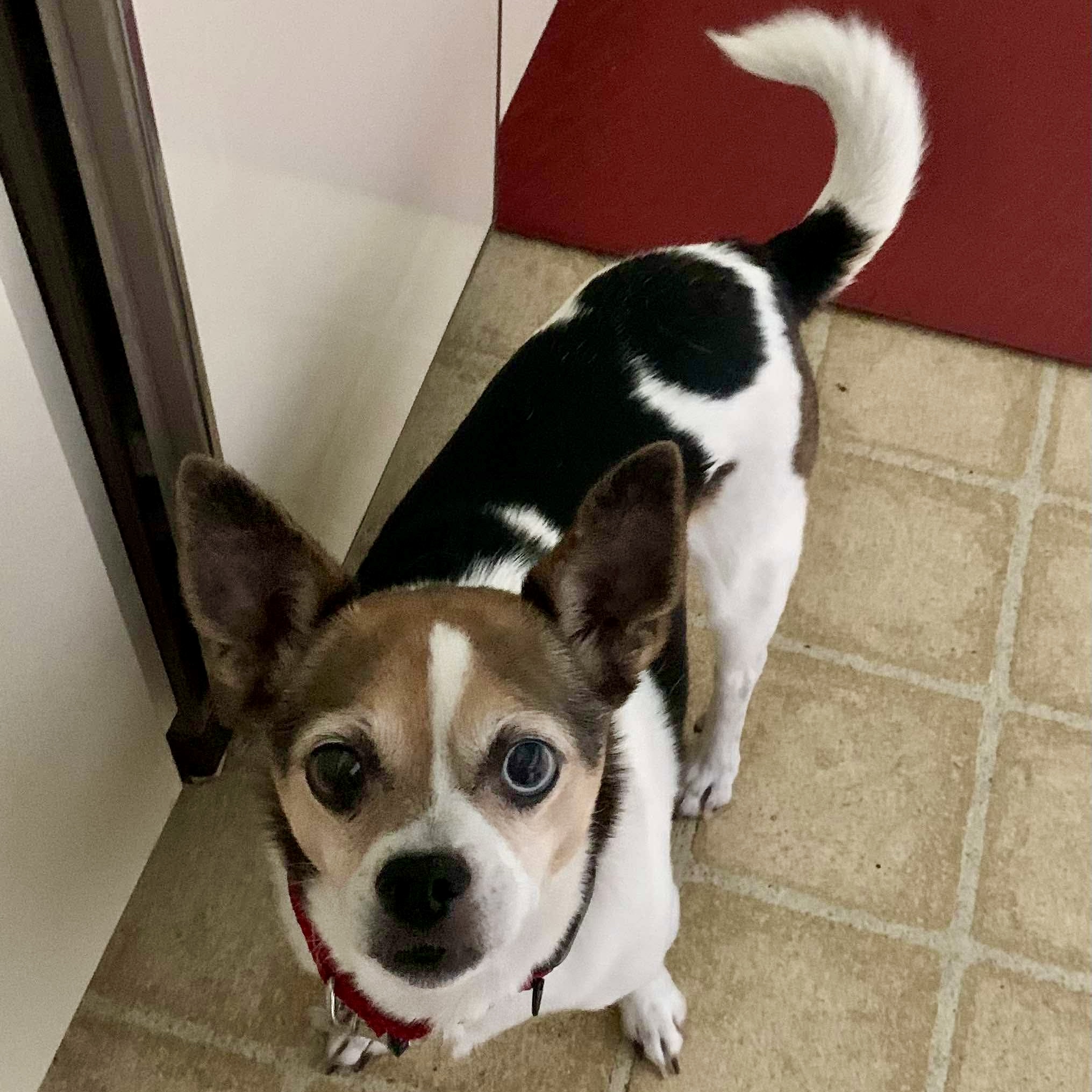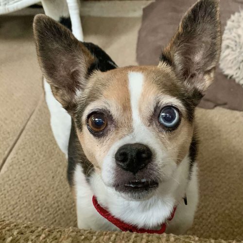 Meet Cleo — a 3-year-old, 13 lb Chihuahua/Pug/Jack Russell mix with a stunning tricolor coat, one mesmerizing blue eye, and a heart full of quiet love.