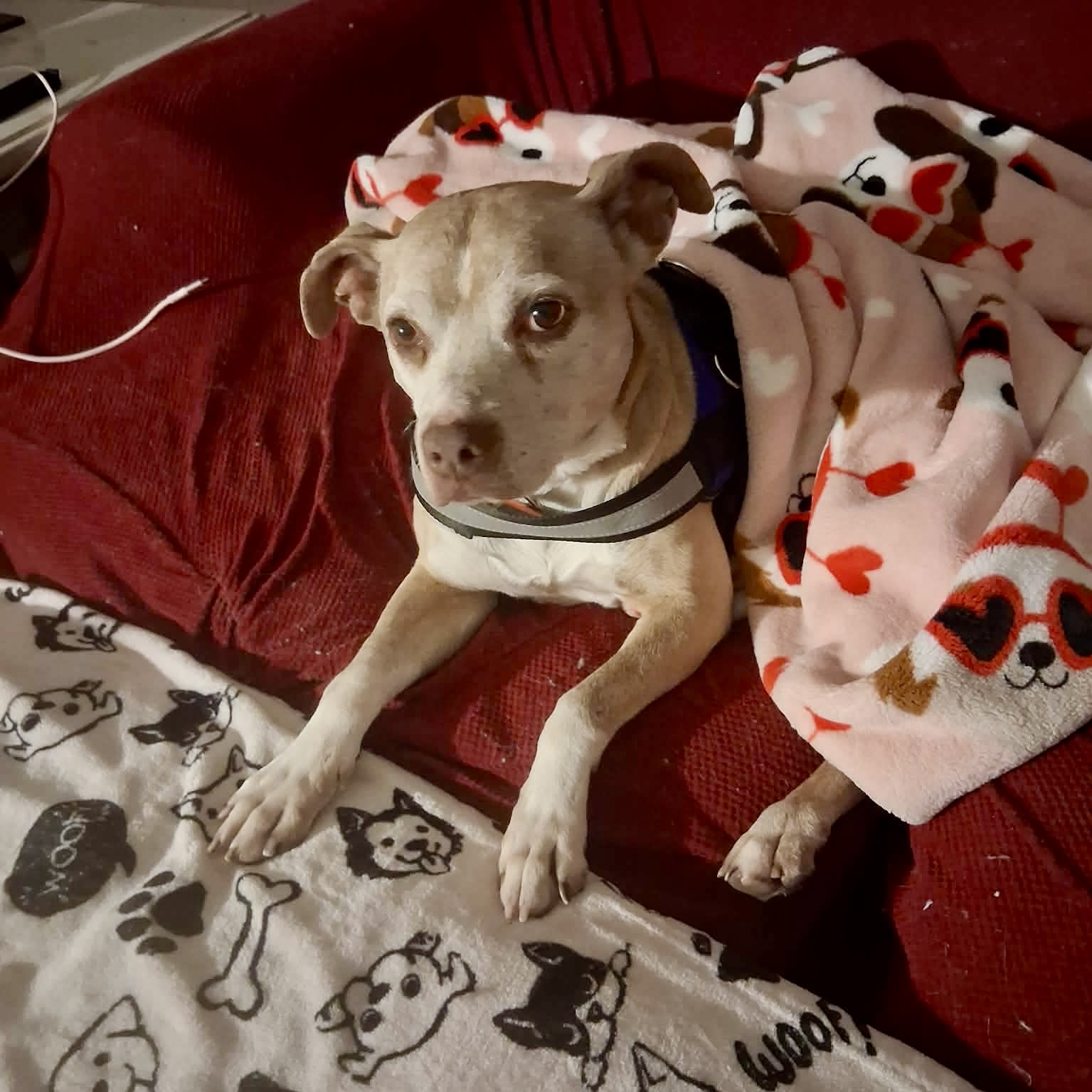 Mavis is completely potty trained, has flawless house manners, and doesn’t need a crate at all. She has zero fear or aggression, gets along beautifully with other dogs, and with her easygoing, submissive nature, she’d likely do wonderfully with cats and respectful children too. After spending years living outside with another dog, she’s now discovering the comforts of indoor life — fluffy blankets, warm beds, and snuggling on the couch with her foster family have quickly become her favorite things!