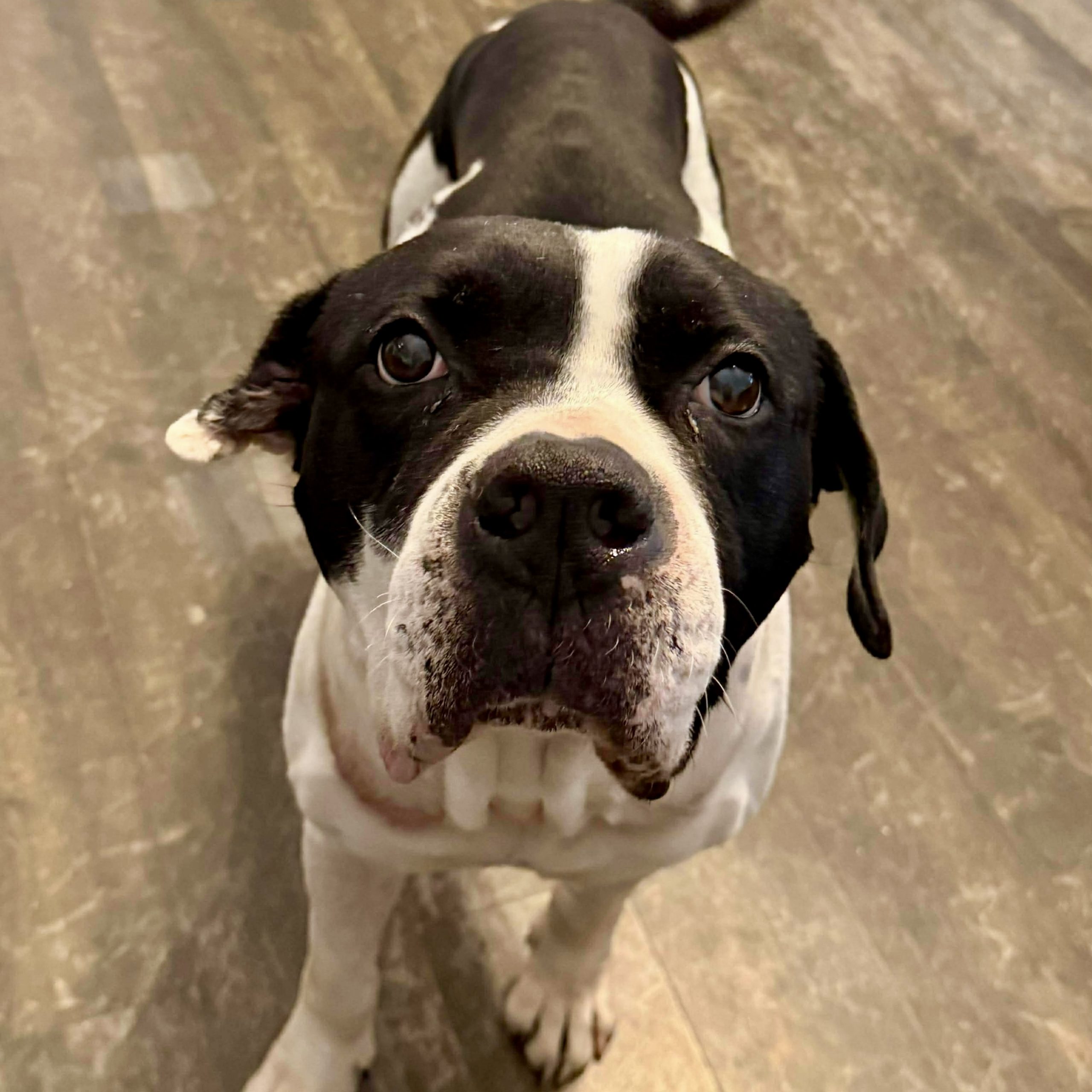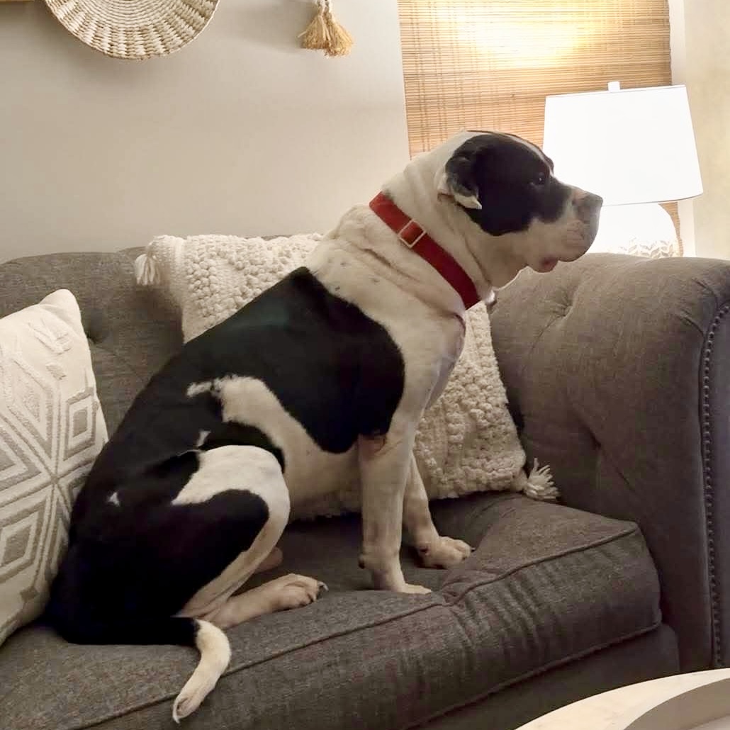 Our best guess is that Mickey is an American Pitbull Terrier mixed breed. American Pit Bulls are known for their loyal, affectionate, and people oriented nature, often forming deep bonds with their families. They’re intelligent, eager to please, and thrive when they’re included in daily life, whether that’s lounging on the couch or joining in on light adventures. Despite their strong, athletic build, many are gentle companions who love human attention and enjoy being part of a routine.