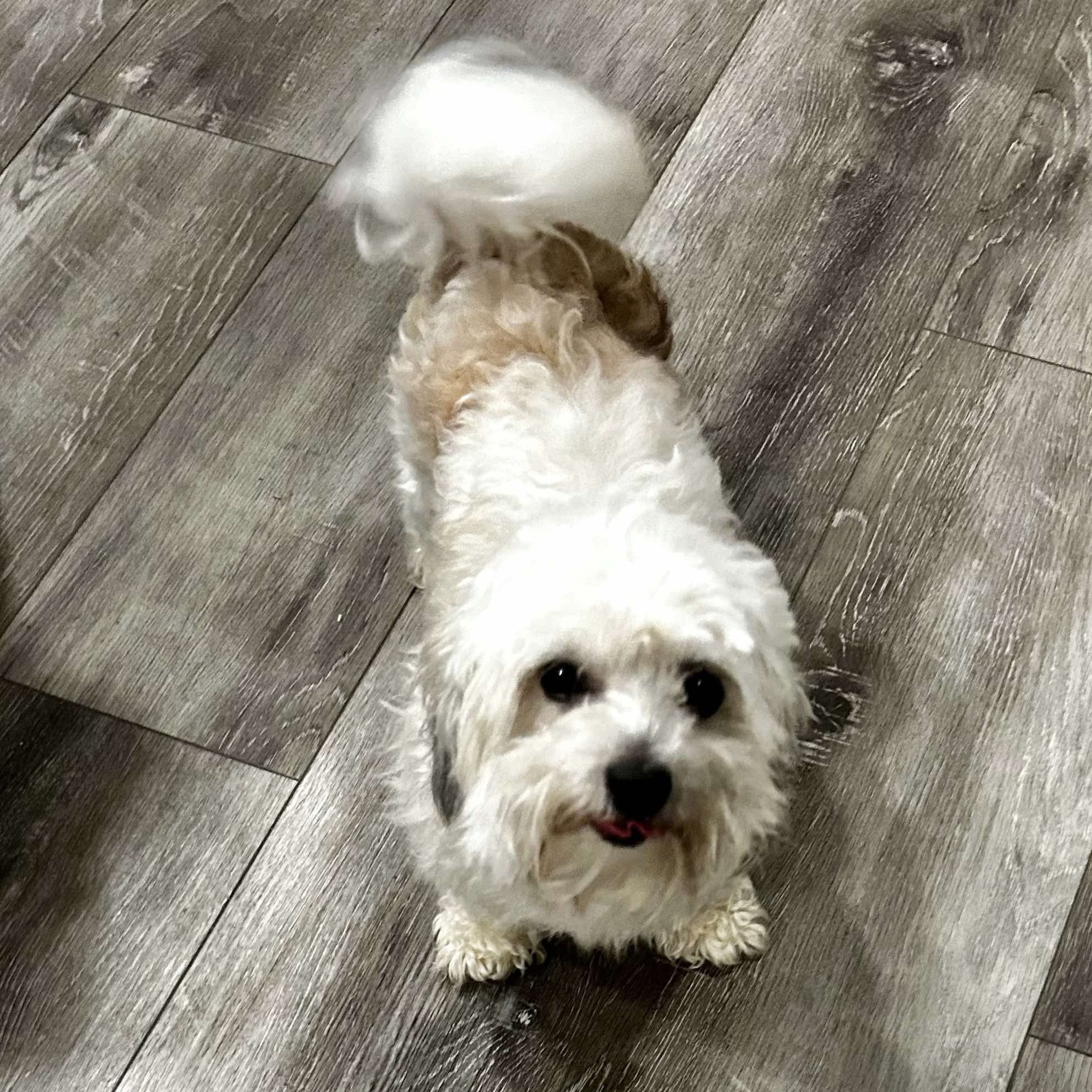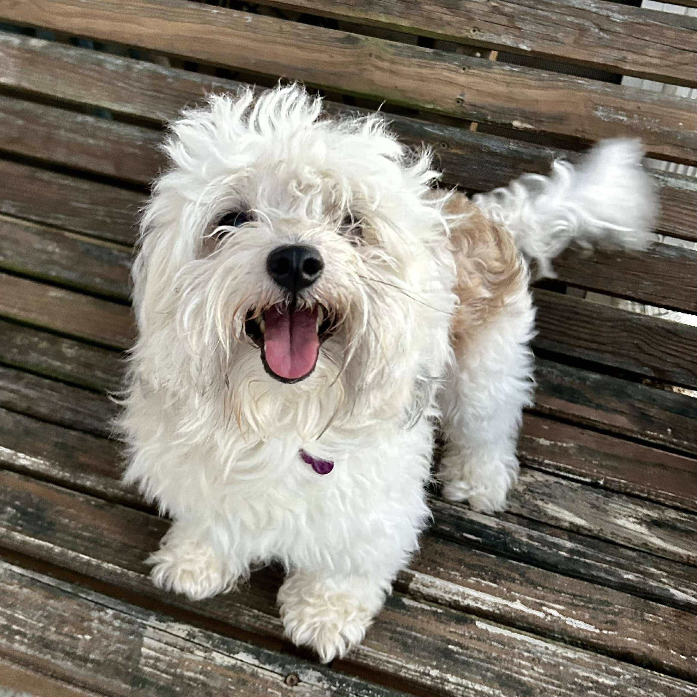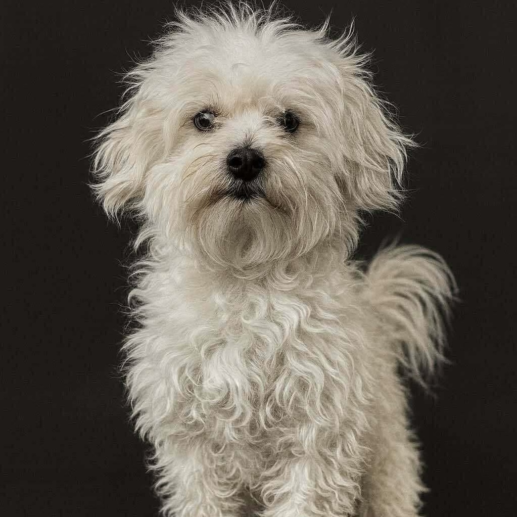 Our best guess is that Pinto is a Maltese/Poodle mix. The Maltese Poodle mix, commonly known as the Maltipoo, is a small, affectionate hybrid that blends the gentle charm of the Maltese with the intelligence and low-shedding coat of the Poodle. Typically weighing between 5–20 pounds, Maltipoos are ideal for apartment living and thrive in homes where they can be close to their people. They are known for being friendly, playful, and easy to train. With their soft, wavy or curly coats and sweet disposition, Maltipoos make wonderful companions for families, seniors, and singles alike.
