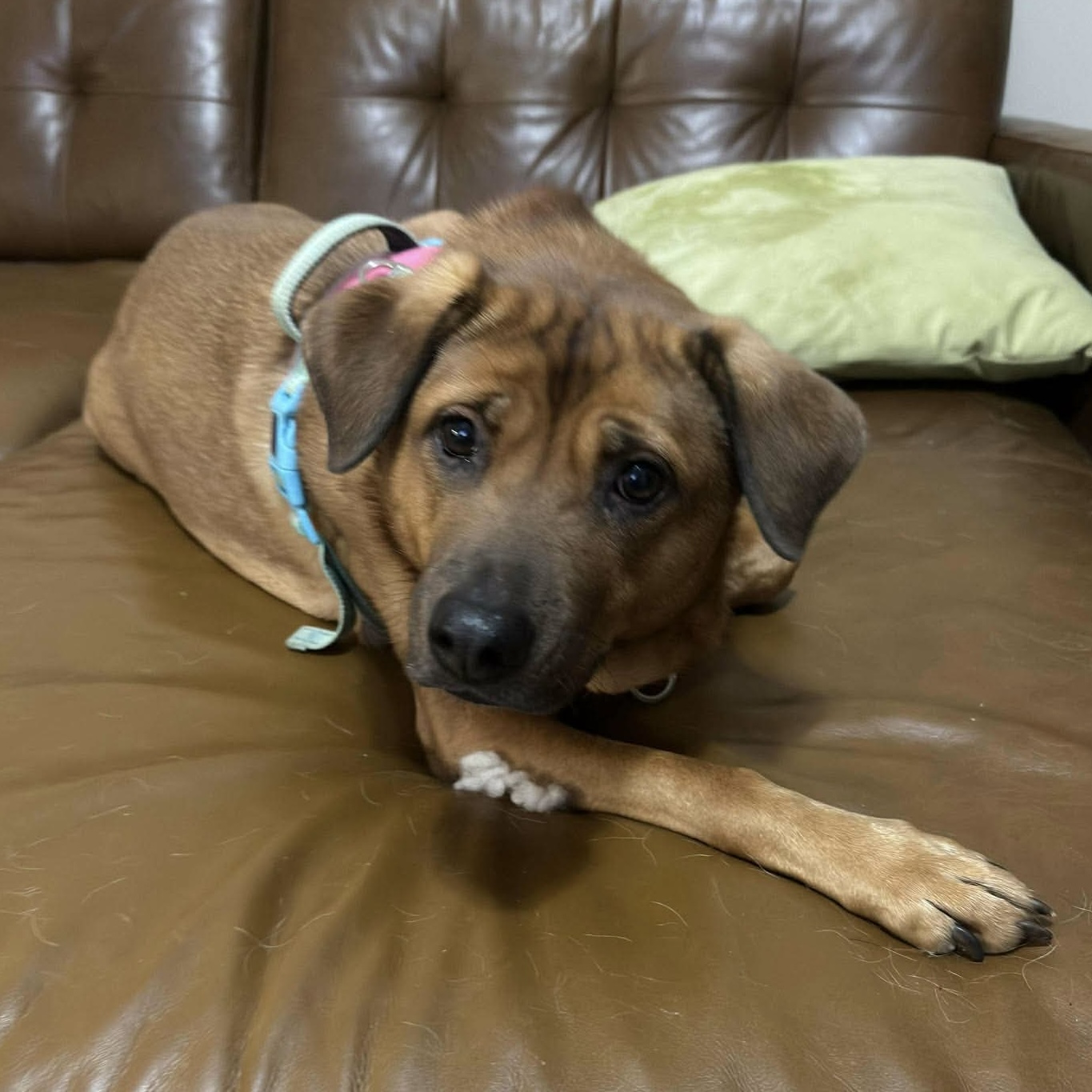 Our best guess is that Roni is a Rhodesian Ridgeback mixed breed. Rhodesian Ridgebacks are known for their loyal, athletic, and deeply devoted nature. Originally bred as hunting and guardian dogs, they’re confident, intelligent, and form strong bonds with their families. Despite their impressive presence, they’re often gentle, affectionate companions who love being close to their people and thrive on routine and connection.