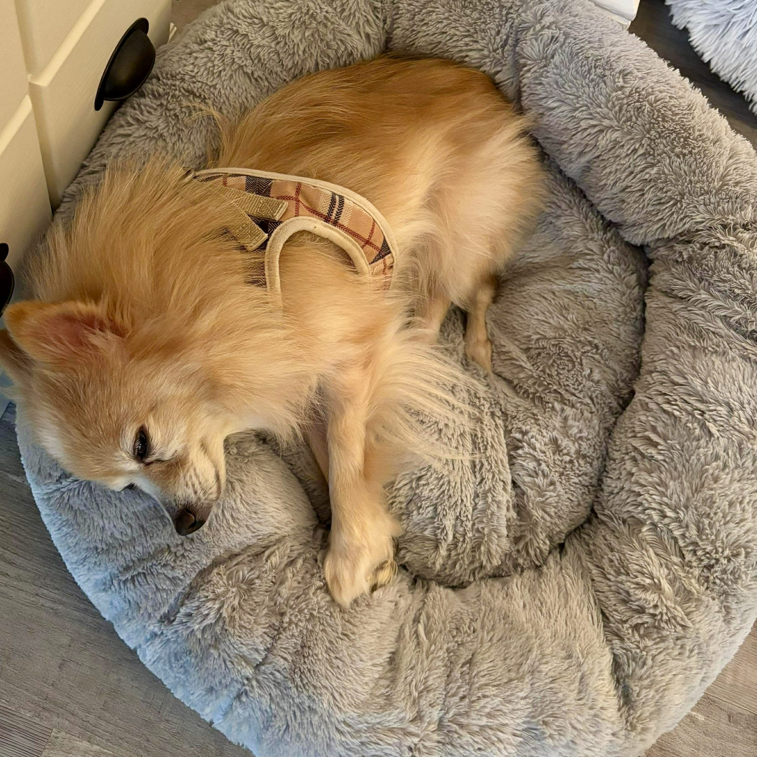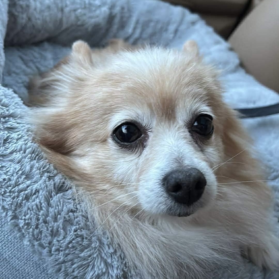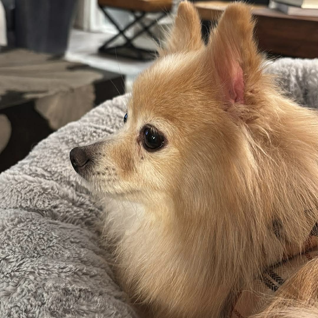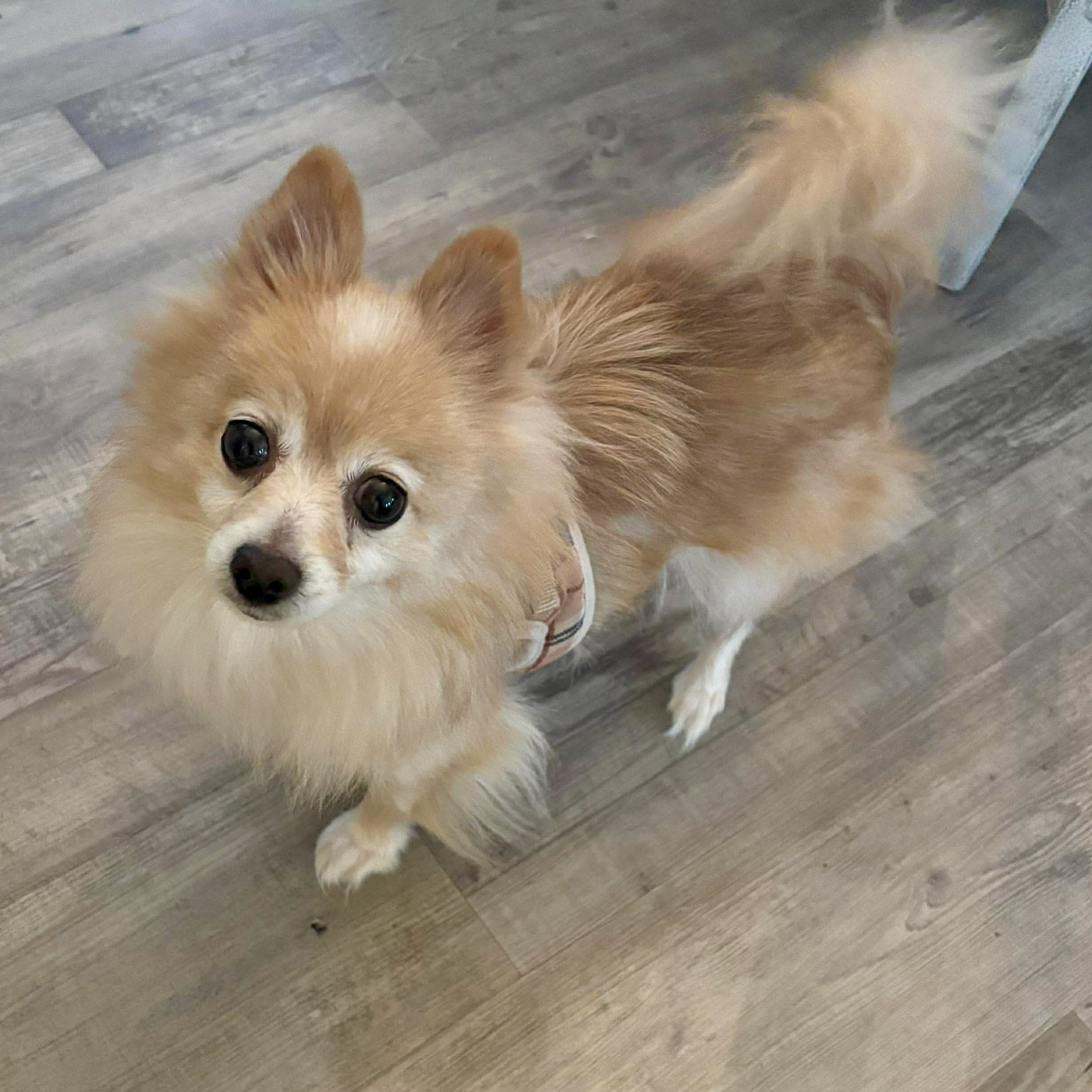 Our best guess is that Ruby is a Pomeranian (possibly mixed) breed. Pomeranians are tiny dogs with big personalities—confident, alert, and full of charm. They’re known for being affectionate with their people, lively in spirit, and surprisingly bold for their small size. Their fluffy coats and bright expressions match their cheerful, curious nature.