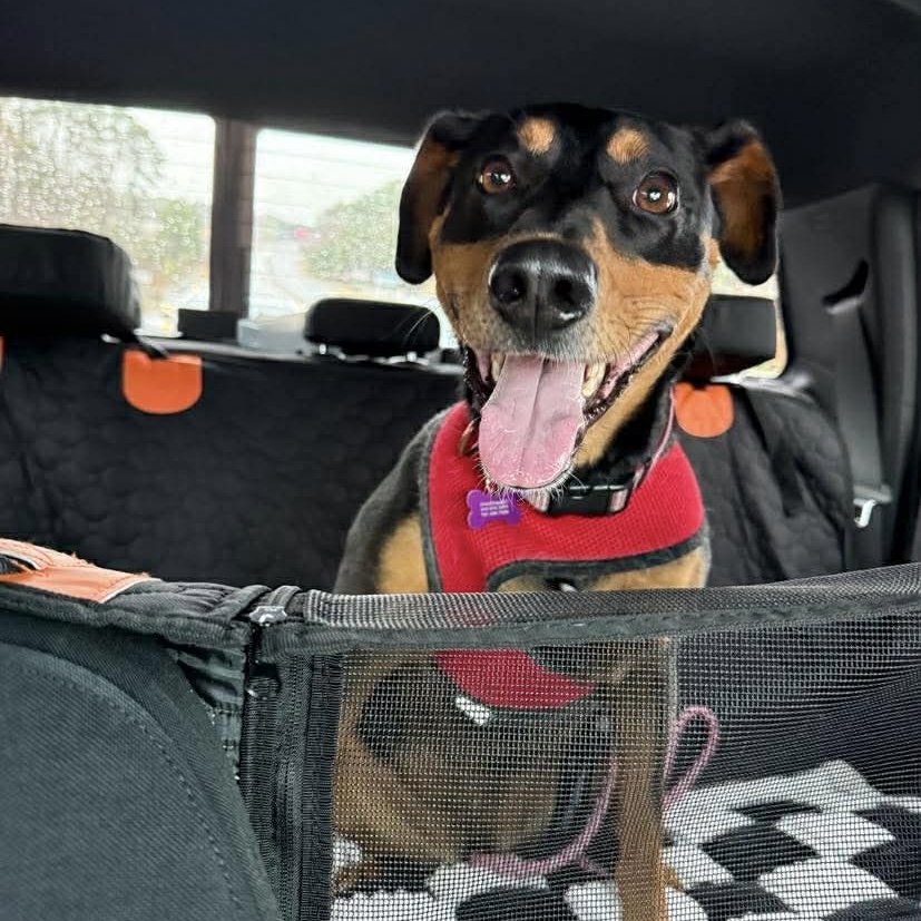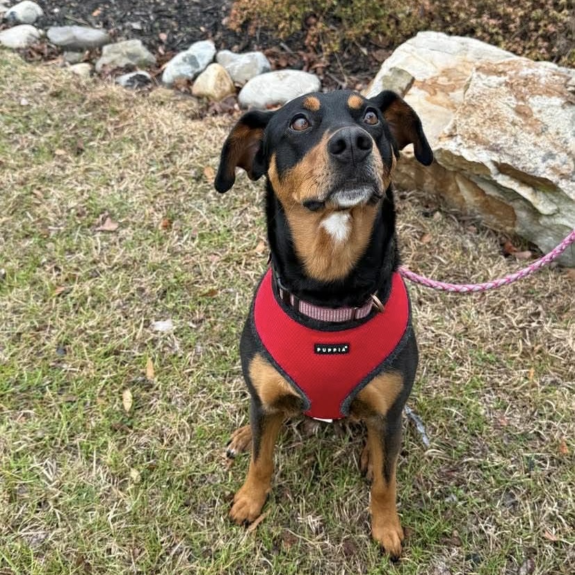 Our best guess is that Sable is a mixed breed of Doberman/Hound mixed breed. Doberman–Hound mixes often blend the athleticism and loyalty of a Doberman with the curiosity and scent‑driven instincts of a Hound, creating a dog who is smart, energetic, and deeply connected to their people. They tend to be alert, playful, and eager to explore, with a mix of working‑dog focus and hound‑dog wanderlust that makes them both engaging and entertaining companions.