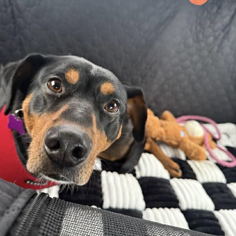 Meet Sable — a 4 year old, 47 lb Doberman/Hound mix with a joyful spirit, a big heart, and a serious love for stuffies.