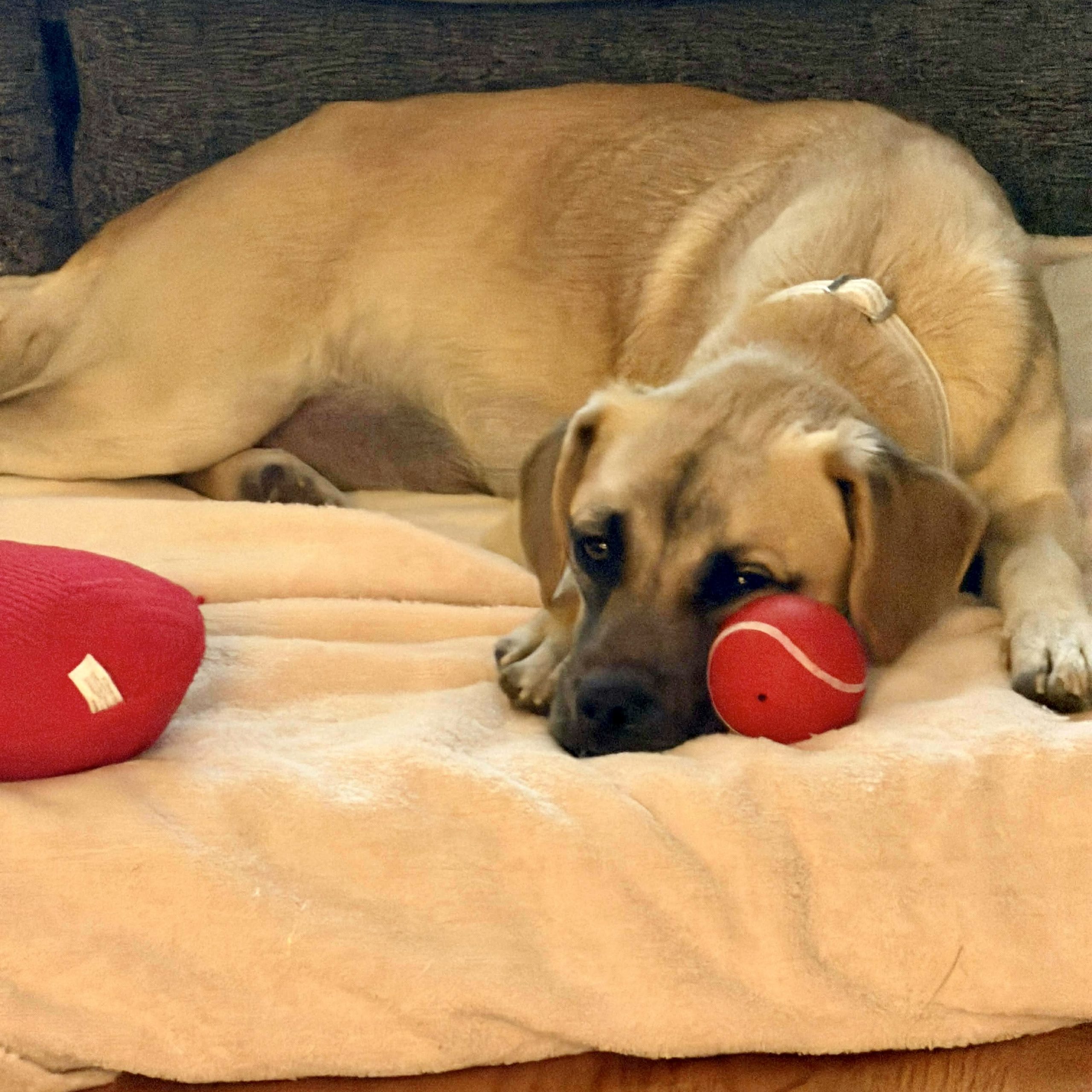 This girl is practically a puppy herself — she loves to run, play fetch, chase balls, and chew on her toys (bones are her favorite!). She has a fun mix of dominant and submissive play styles and absolutely adores people. Even with her rough past, she greets her foster family with nonstop tail wags and a happy heart!