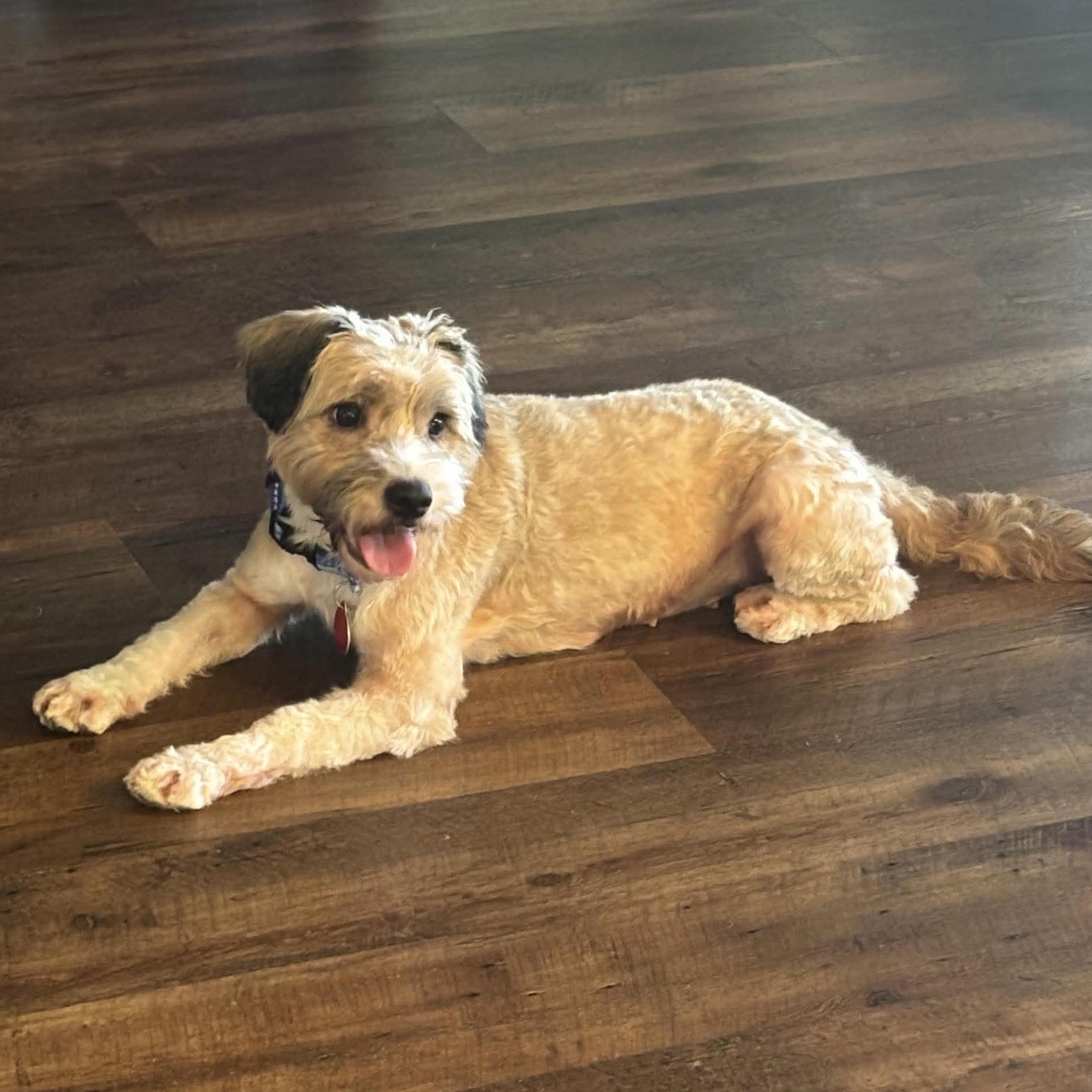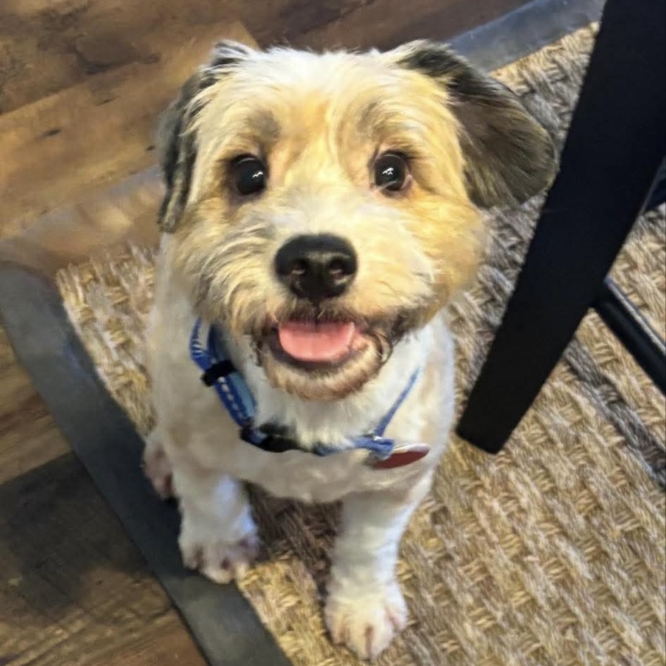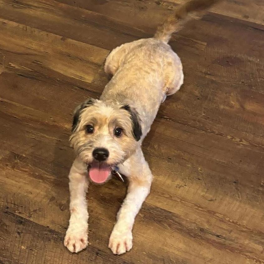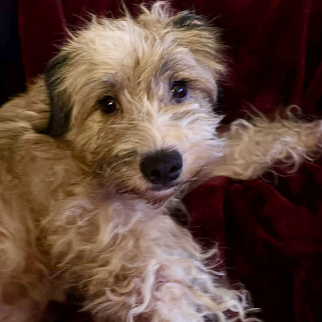 Our best guess is that Wiggles is a Terrier and Poodle mix. Terriers are a clever, brave, and tenacious breed and known for their loyalty and deep bond with people. Some terriers can have more energy than others which speaks to Wiggles’ zoomies!